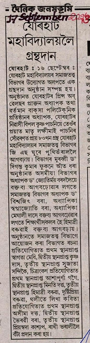 http://jorhatcollegedigitallibrary.in:8080/xmlui/handle/123456789/119| Title: | Book Donation Program organised by Dept. of Sociology |