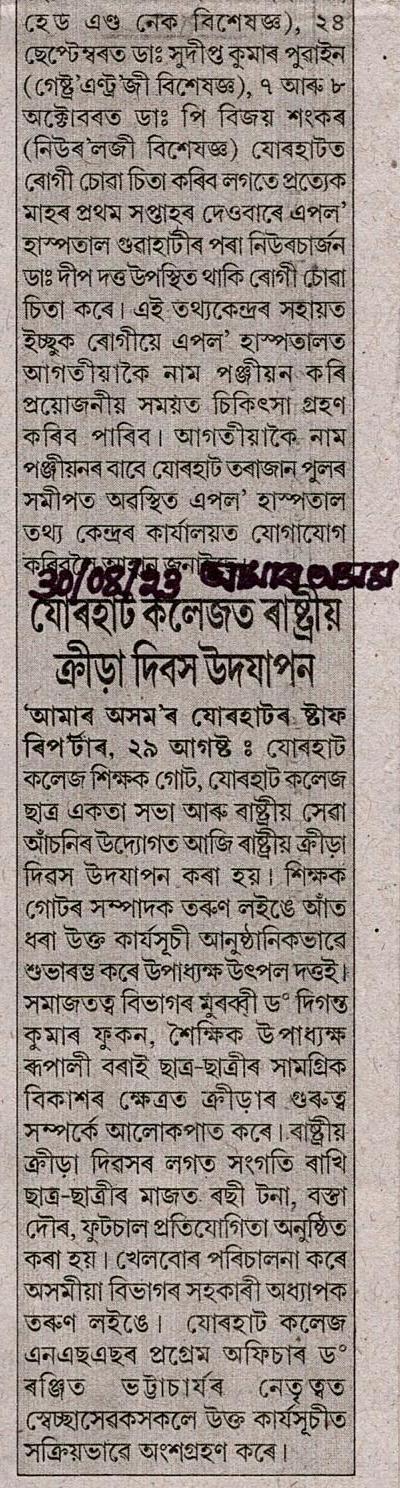 http://jorhatcollegedigitallibrary.in:8080/xmlui/handle/123456789/213| Title: | Observation of National Sports Day organised by Teachers' Unit, Students' Union & NSS |