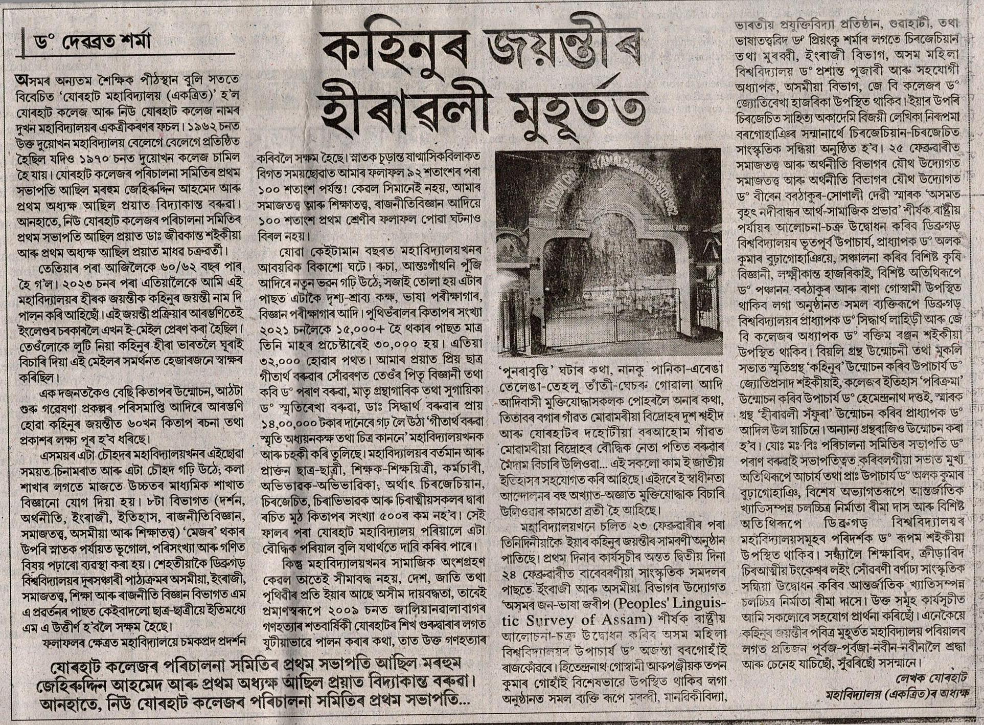 http://jorhatcollegedigitallibrary.in:8080/xmlui/handle/123456789/232| Title: | Article on Kohinoor Jayanti BY Dr. Devabrata Sharma |